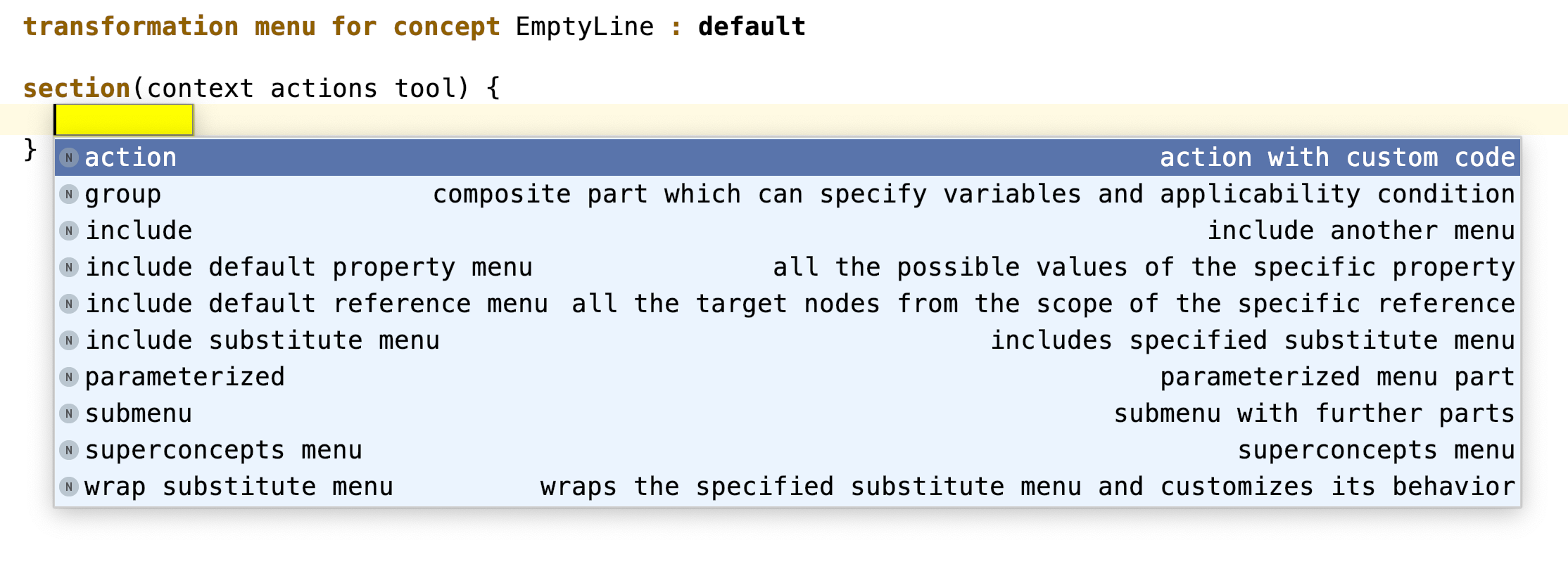 Each concept has a default transformation menu associated. If the language designer does not provide one explicitly, a transformation menu defined for the closest super-concept is assumed. If none is specified for any of the super-concepts, the one defined on BaseConcept is used, which contains the substitute actions suitable for that position (see below the section on substitute actions).