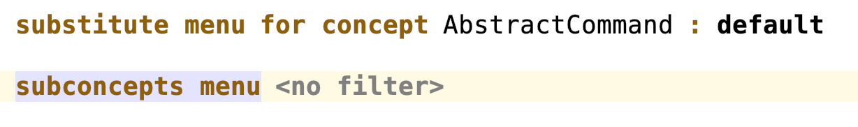 By defining a default substitute menu for a concept you may customize the contents of the completion menu, which displays when the user presses Control + Space. It also has effect on sub-concepts of the concept, unless these sub-concepts define their own default substitute menus.