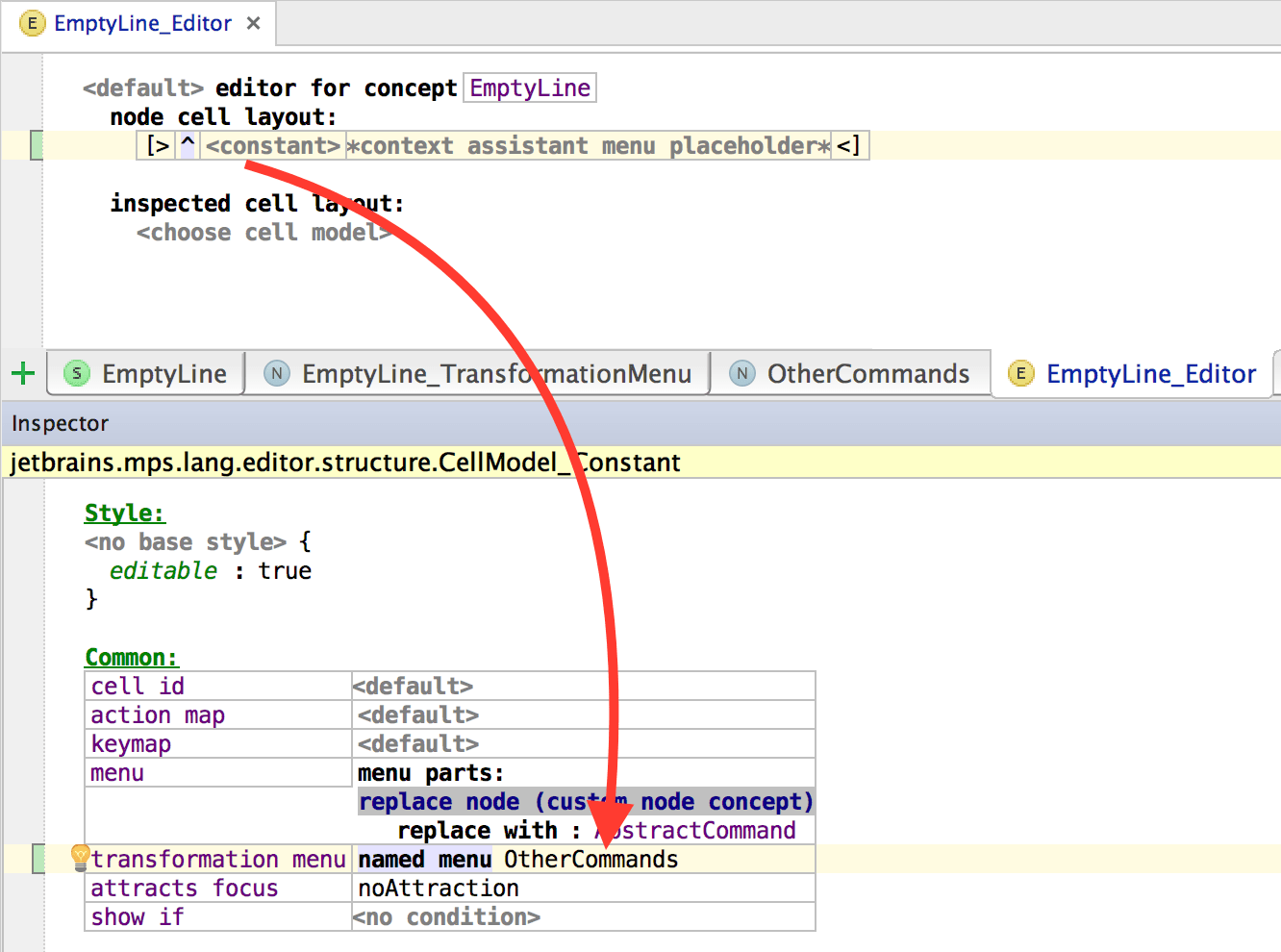 The customization of the menu for the property/reference cells can be done with the property/reference transformation menu parts . Suppose you want to customize the completion menu of the reference/property cell. Previously, it could have been done by defining the "inline menu" in the inspector. Now it can be done also via the Transformation Menu. We have introduced the property and the reference transformation menu parts. The reference transformation menu part includes the actions, which set the target node to the specific reference. The target nodes come from the scope for that reference. The same goes for the property menu part: it takes the values of the property type and includes actions, which set the value to the specific properties.