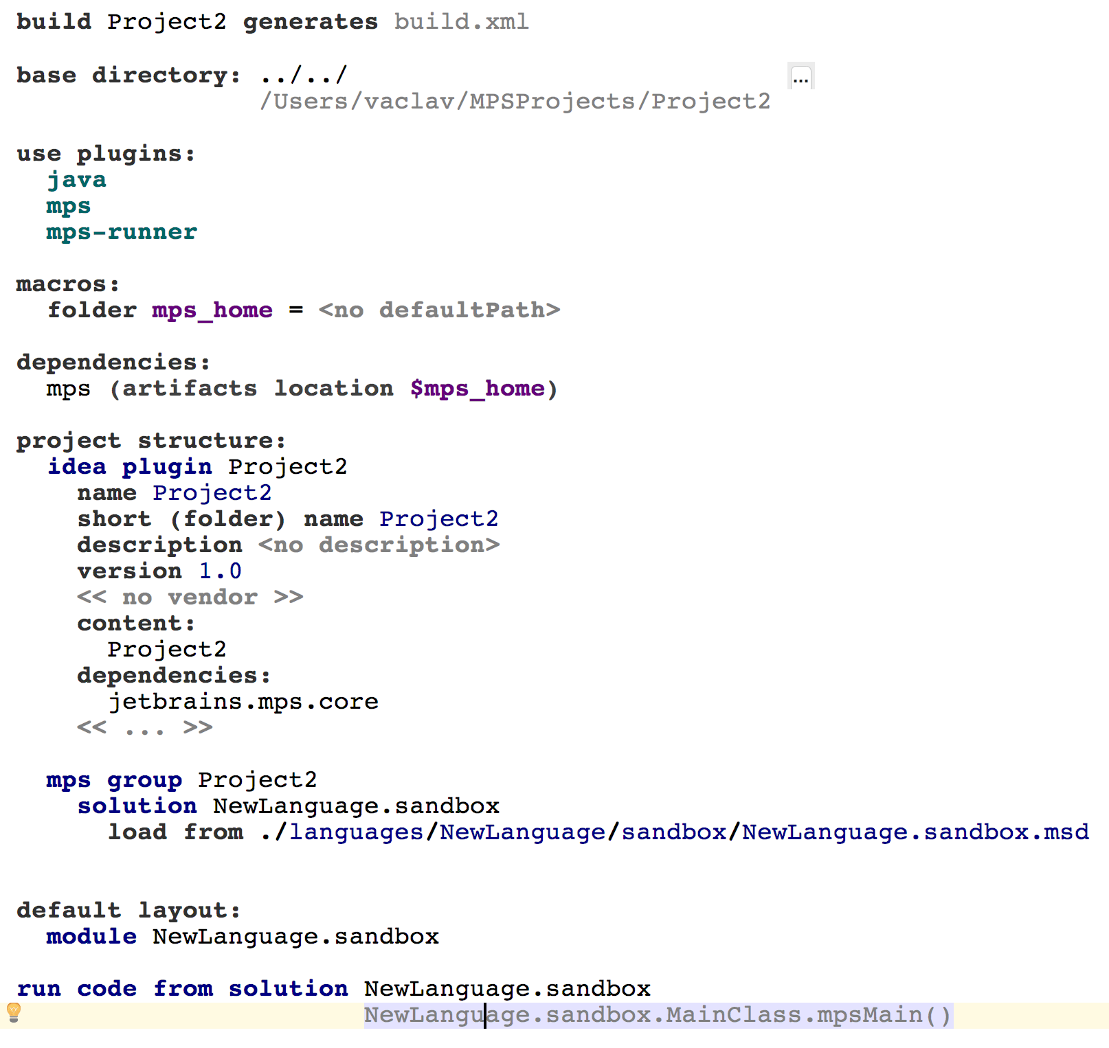 Build Language is an extensible build automation DSL for defining builds in a declarative way. Generated into Ant, it leverages Ant execution power while keeping your sources clean and free from clutter and irrelevant details. Organized as a stack of MPS languages with ANT at the bottom, it allows each part of your build procedure to be expressed at a different abstraction level. Building a complex artifact (like an MPS plug-in) could be specified in just one line of code, if you follow the language conventions, but, at the same time, nothing prevents you from diving deeper and customize the details like file management or manifest properties.