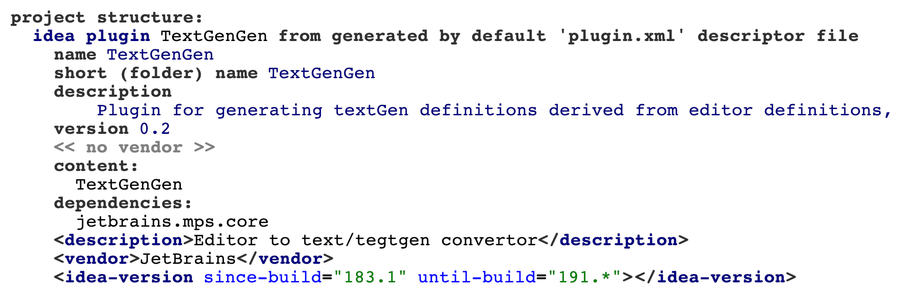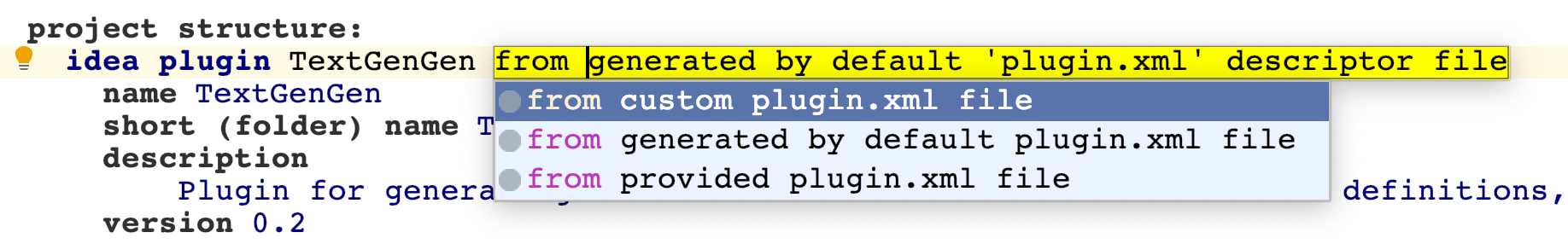 The first section of the plugin declaration consists of various information describing the plugin: its name and description, the name of the folder, the plugin vendor, etc.. The important string here is plugin id , which goes after the keywords idea plugin. This is the unique identifier of the plugin among all the others. There are three options of how the plugin.xml file gets constructed. It can either use solely the information contained in the idea plugin section of the build script, enrich the information with content of a provided plugin.xml file or use solely a custom plugin.xml file.