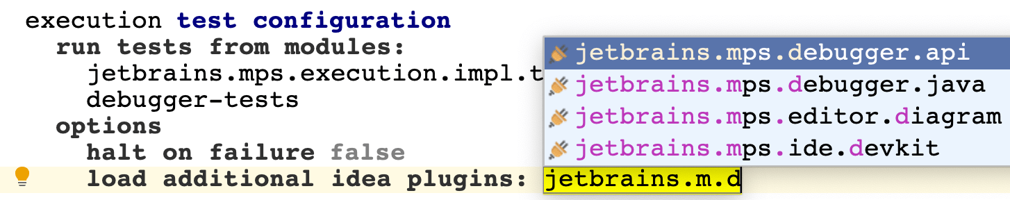 The test modules run configuration construction supports a possibility to specify additional idea plugins which ought to be loaded during the MPS ant test execution. The plugins required for the MPS ant test execution sometimes cannot be calculated automatically. There are scenarios when the tests need a particular plugin available and that information cannot be deduced from the modules containing the tests by the MPS build language engine. In such situations the needed plugins can be specified manually.