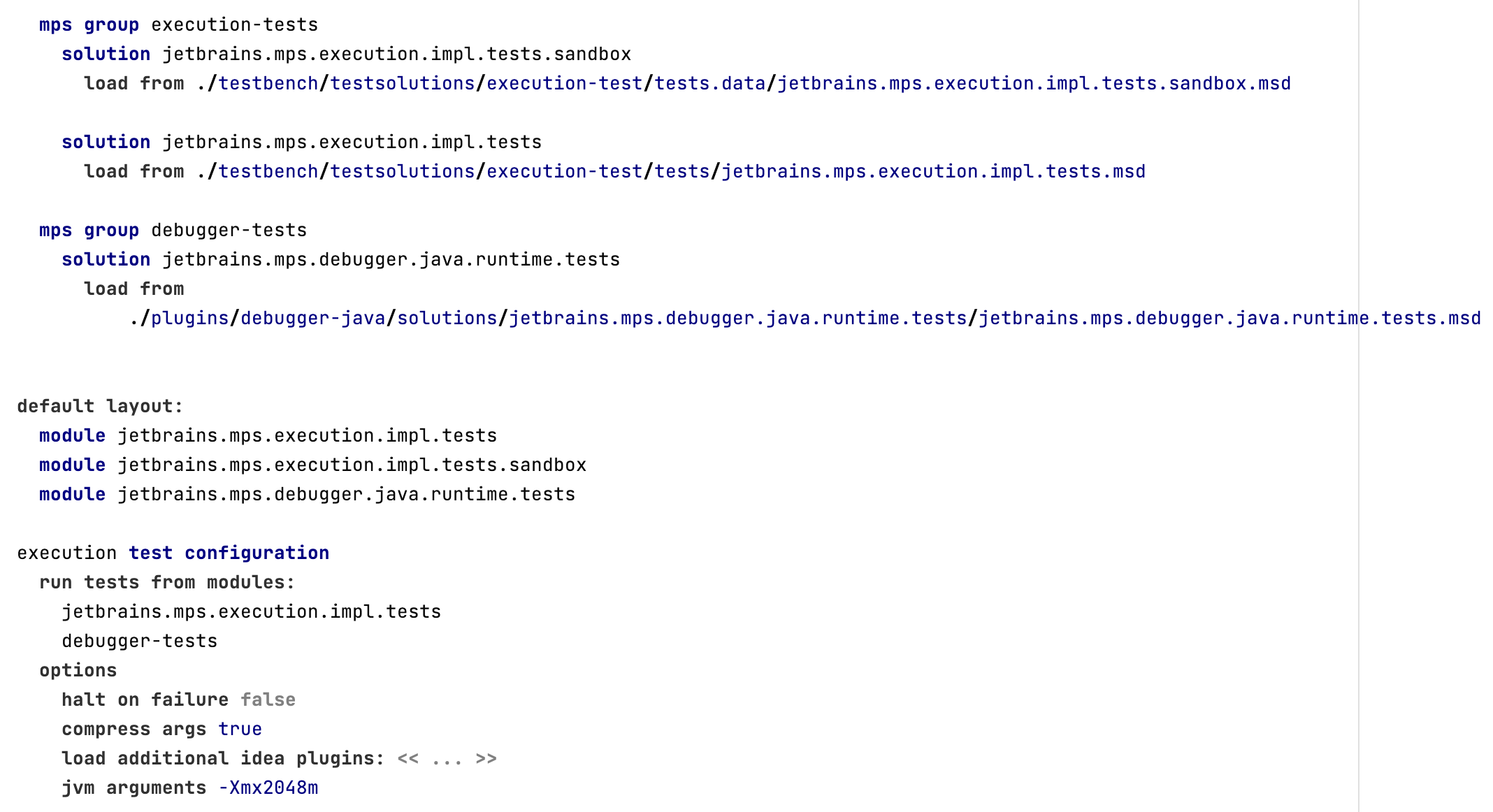 Solutions/module groups with tests are grouped into test modules configurations, which is a group of solutions with tests to be executed together in the same environment. All required dependencies (i.e. modules and plugins) are loaded into that environment. In the screenshot, you can see a test modules configuration, named execution, which contains a solution jetbrains.mps.execution.impl.tests and a module group debugger-tests.