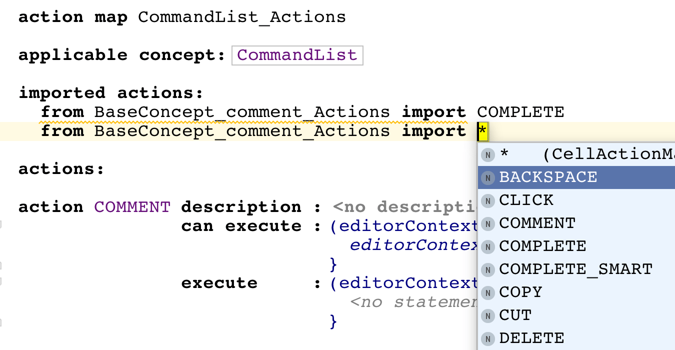 Next applicable editor | A more specific editor may reuse a less specific editor of the same concept through the new next applicable editor editor cell. The next applicable editor cell is used as a place holder, which will re-apply the logic for finding the less specific editor and insert the found editor in its place. For example, an editor specific to a particular context hint may provide some visual ceremony around a next applicable editor cell. By removing the context hint on the next applicable editor cell, MPS will reevaluate the editor-discovery logic and supply the found editor into the next applicable editor cell. ![]() In particular this mechanism is frequently being used to implement editors for "commented out" nodes when customizing the generic comment out functionality. |