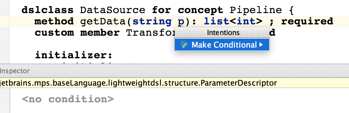 Methods can have some parameters marked as conditional, so that they only become visible in user code when the provided condition is satisfied. To mark a parameter as conditional you can use the corresponding intention: