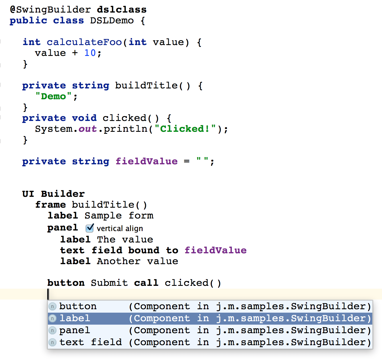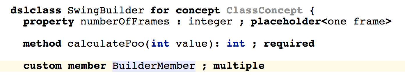 dslclass SwingBuilder for concept ClassConcept { property numberOfFrames : integer ; placeholder<one frame> method calculateFoo(int value): int ; required custom member BuilderMember ; <modifiers> initializer: {node<ClassConcept> node, model model => } }