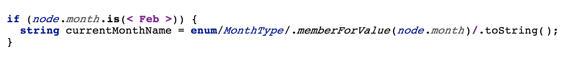 Enumeration members can be queried for their name and presentation. Checking a value of a property against an enum data type value can be done with the is operation.