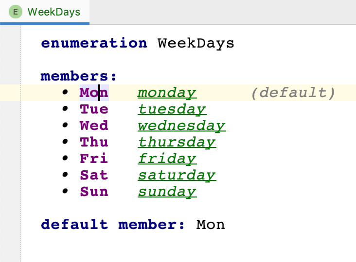 • Presentation (right column) - this string value is used to represent the enum members in a user model (completion menu, editor). If no presentation is explicitly defined, the name is used instead.