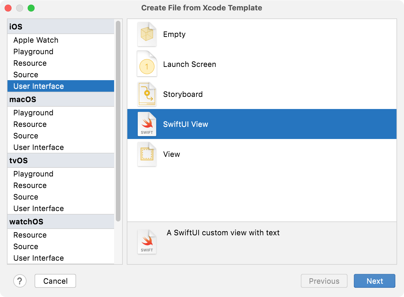 iOSConferencesgroup, press Alt+Insert, and select File from Xcode Template….In the dialog that opens, select and click Next: