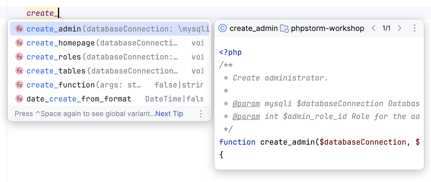 In case of CamelCase or snake_case names, type the initial letters only. PhpStorm automatically recognizes and matches the initial letters.