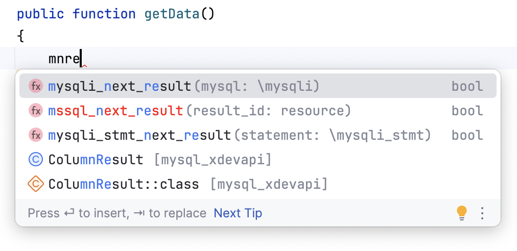 PhpStorm analyzes the context and suggests the choices that are reachable from the current caret position. Suggestions also include Live templates. Completion is available for a non-English keyboard layout.