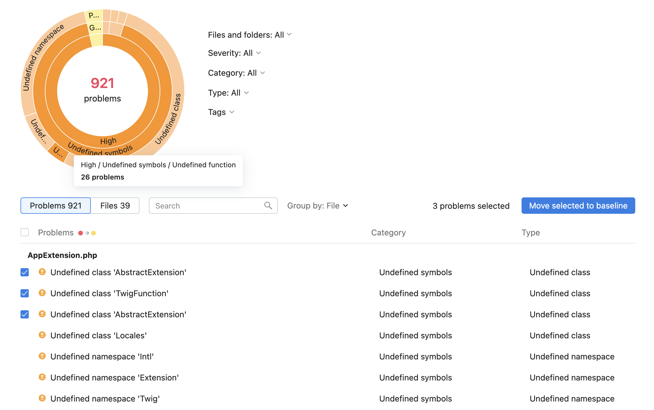 Every inspection has a severity level — the extent to which a problem can affect your code. Severities are highlighted differently in the editor so that you can quickly distinguish between critical problems and less important things. PhpStorm comes with a set of predefined severity levels and enables you to create your own.