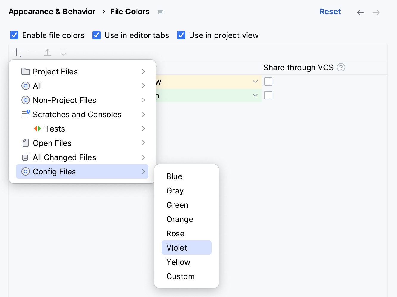 To share a color through a VCS, select the checkbox on the corresponding line in the Share through VCS column. If the checkbox is cleared, the color will be used locally.