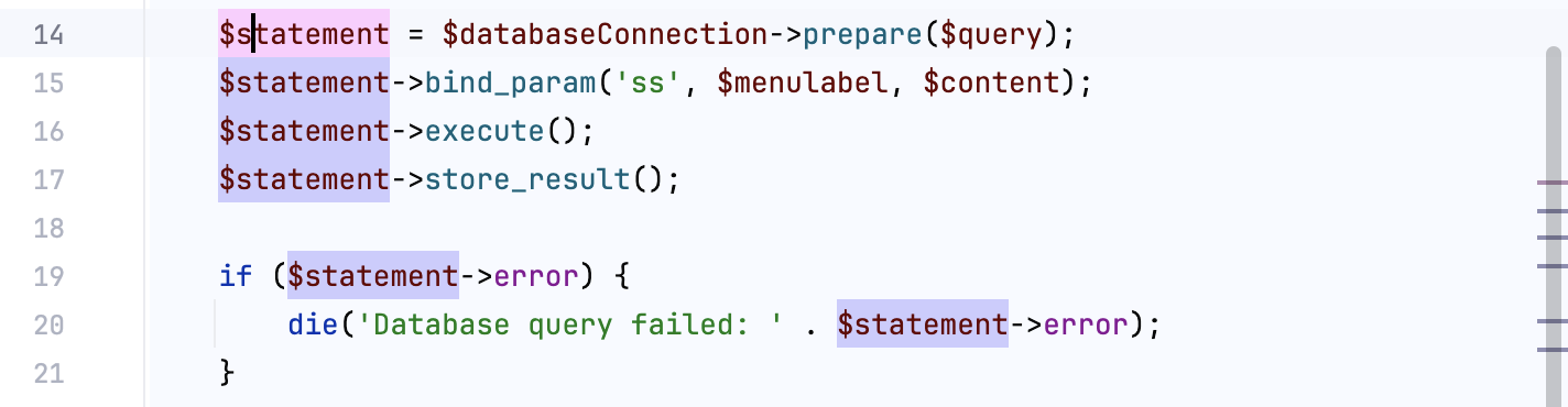 extends,implements,use,use trait,return,try,catch,@throws,break, orcontinuekeyword.Symbols' usages are highlighted with regard to their scope. For example, highlighting for