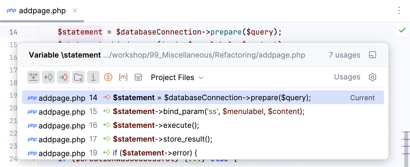 @throwsis not applied inside nested classes and functions.Go to Ctrl+F7. PhpStorm selects the first usage occurrence in the file.