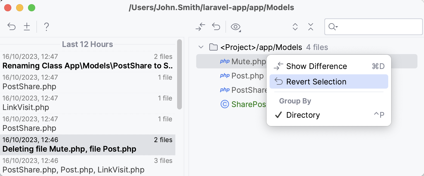 Similarly to viewing Local History for one file, you can view it for an entire folder, project, or multiple individual files.