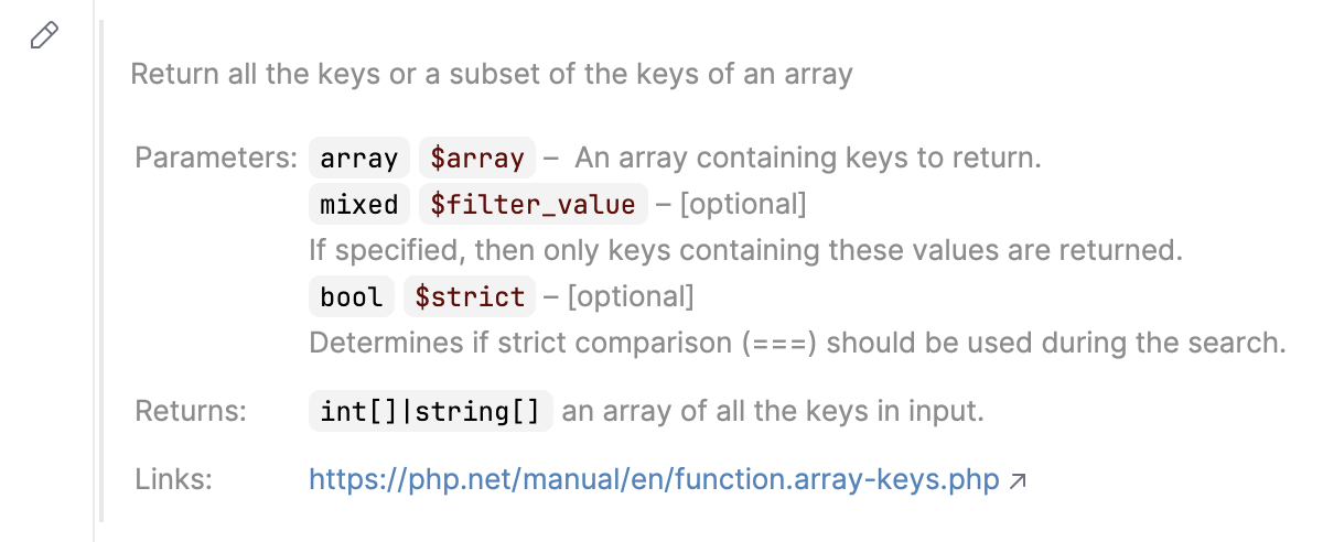 Rendered PHPDoc comments allow you to click links to go to the referenced web pages or view quick documentation for the referenced topics.