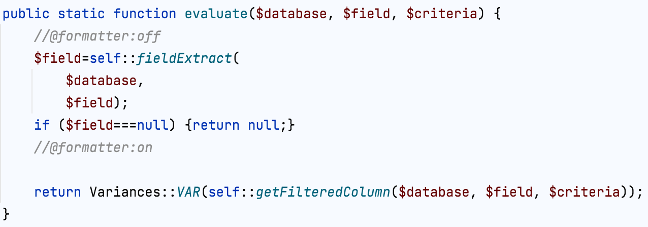 The example shows two code fragments. One of them is enclosed in the @formatter:off and @formatter:on markers while the other one is not.