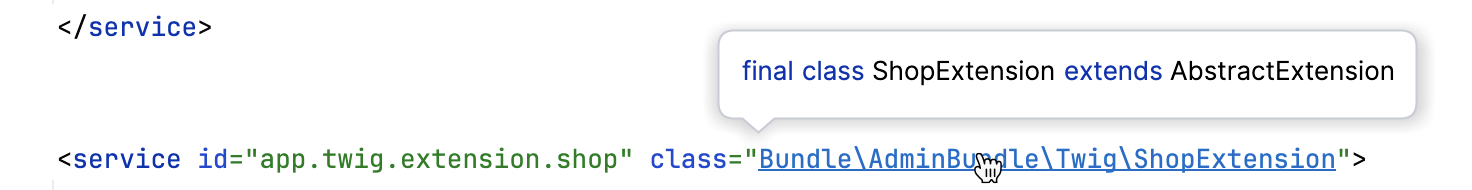 The Navigate to declaration command will also let you navigate between the service implementation and the route it is registered in. For example, you can jump from the Filesystem class to the services.xml file in which the class is registered. From there, you can navigate back to either the registered implementation of the service or its usage.