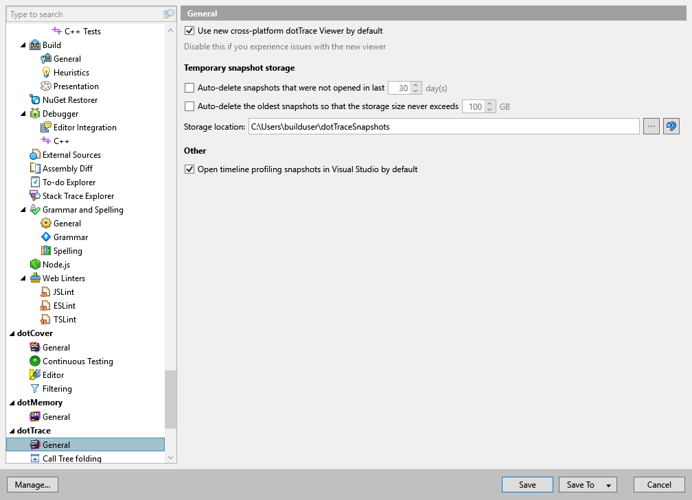 Open timeline profiling snapshots in Visual Studio by default | If enabled, double-click a particular snapshot in the Performance Profiler window will open the snapshot in the viewer integrated in Visual Studio. Otherwise, the snapshot will be opened in a standalone dotTrace viewer. |