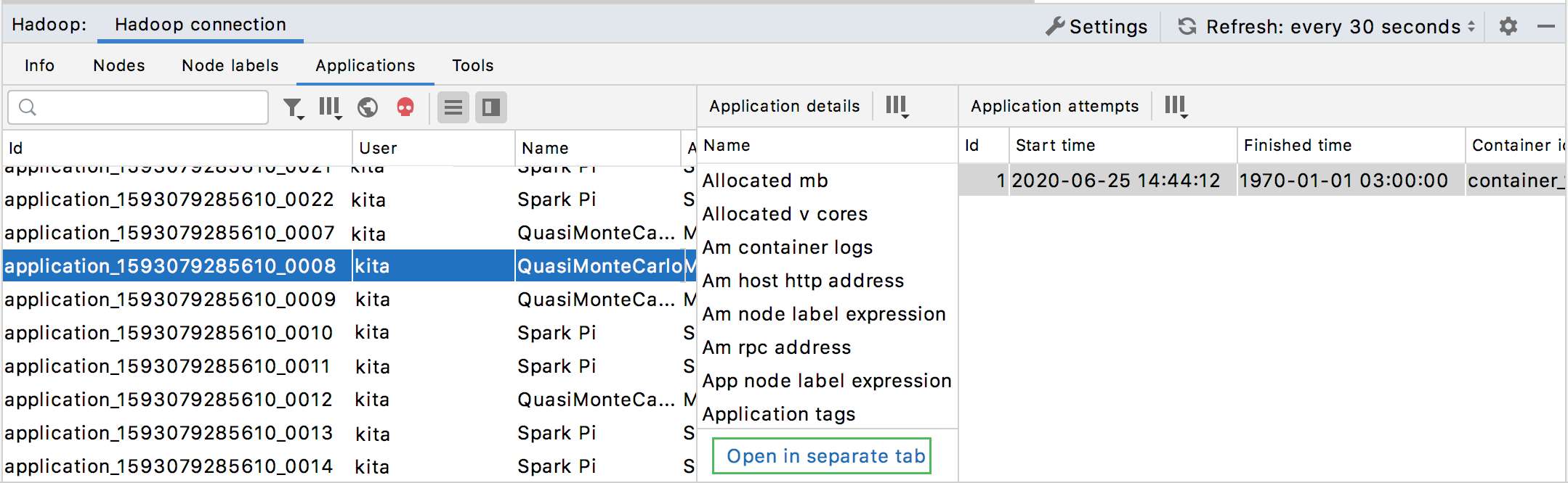 At any time, you can click on the Hadoop YARN tool window to manually refresh the monitoring data. Alternatively, you can configure the automatic update within a certain time interval in the list located next to the Refresh button. You can select 5, 10, or 30 seconds.