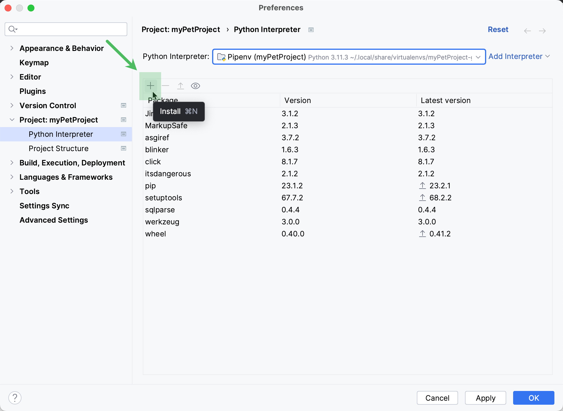 PyCharm tracks the status of packages and recognizes outdated versions by showing the currently installed package version (column Version), and the latest available version (column Latest version). When a newer version of a package is detected, PyCharm marks it with the Upgrade icon.