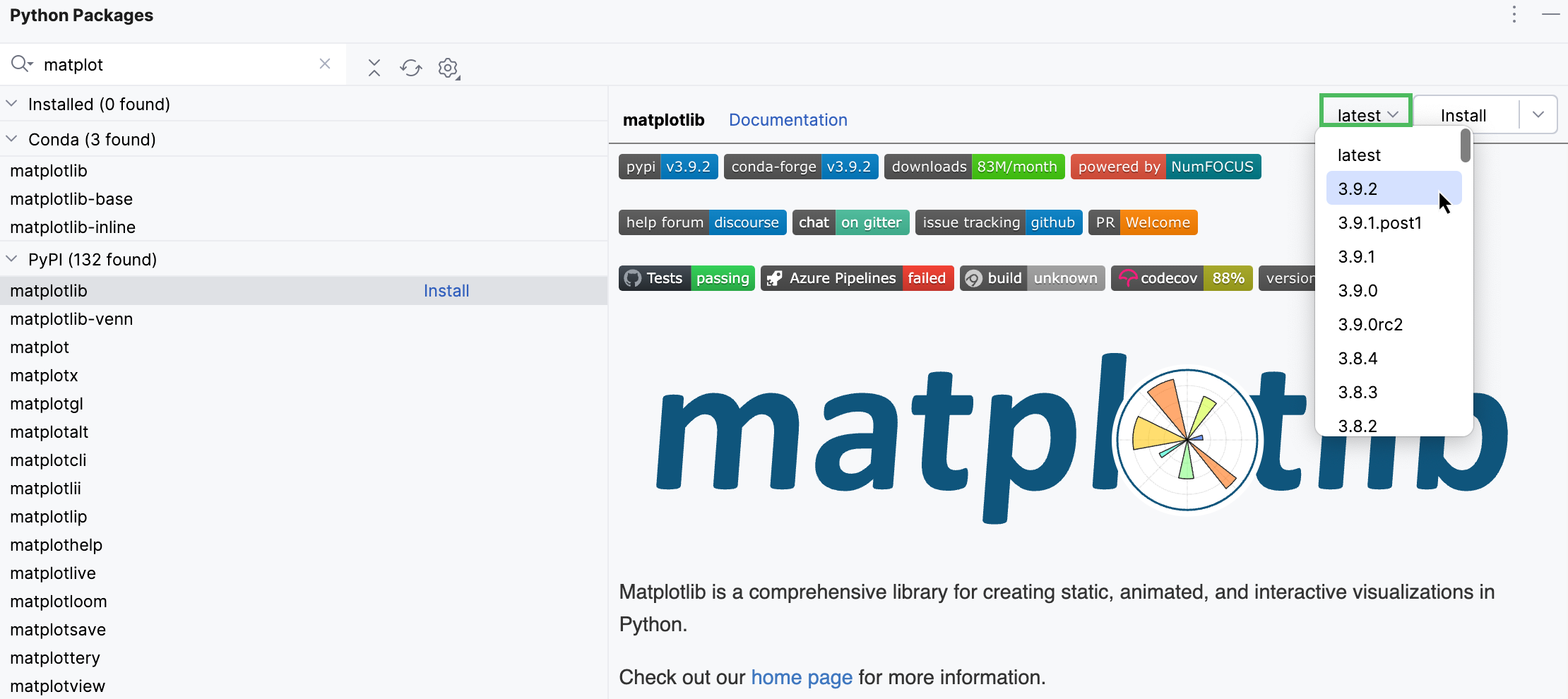 Click Install next to the package name and choose the version.