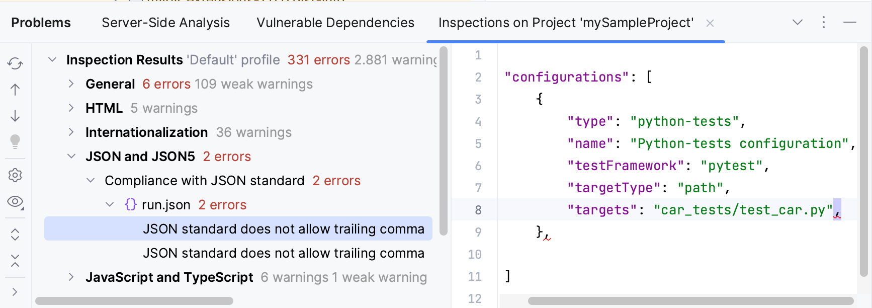 The Problems tool window displays problems that PyCharm detects in your project on several tabs.
