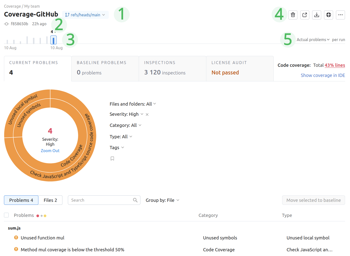 1. Branch selector. Using it, you can view reports for each branch in your project.