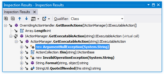 In the Inspection Results window that opens, you can expand the member node to run code analysis and to display all members that call the current member. You can also expand each of the child nodes.