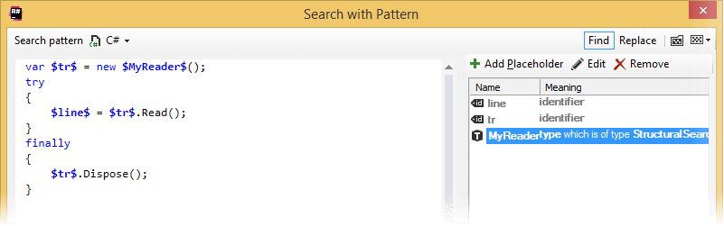 ReSharper displays the Search with Pattern dialog with the selected code pre-parsed as the search pattern. Some identifiers, arguments, types, and so on, are automatically replaced with placeholders: