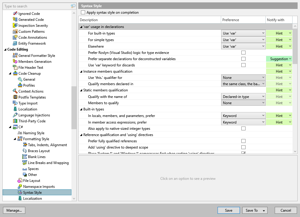 You can also change specific syntax style preferences right in the editor, by pressing Alt+Enter where style violations are highlighted. For example, you can change the preference of 'var' usage in declarations for simple types: