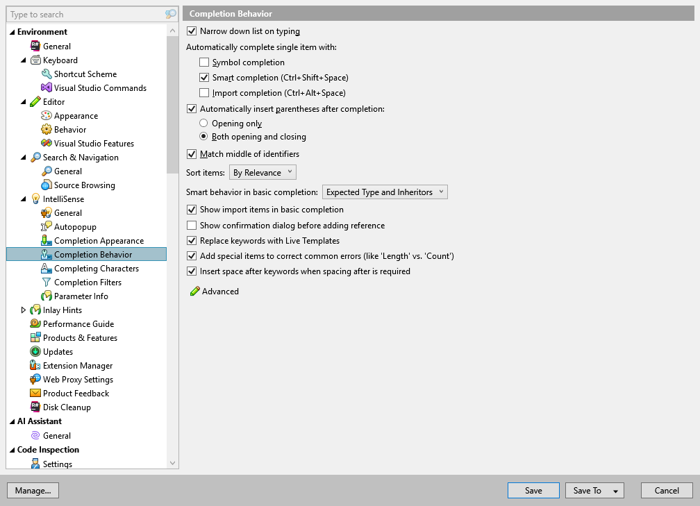Smart Behavior in basic completion | This selector allows you to add expected types and/or inheritors to basic completion lists. If these features are enabled, more suggestions (static members, lambda expressions, and so on) appear. Also, the symbols that fit to the context are automatically preselected. If a value other than 'None' is chosen, some performance degradation is possible. |