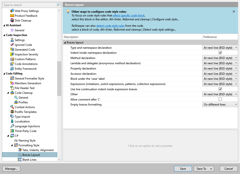 Use this page to adjust the way ReSharper arranges braces when it generates new and reformats existing code; in particular, there are several ways to position braces after if or for operators.