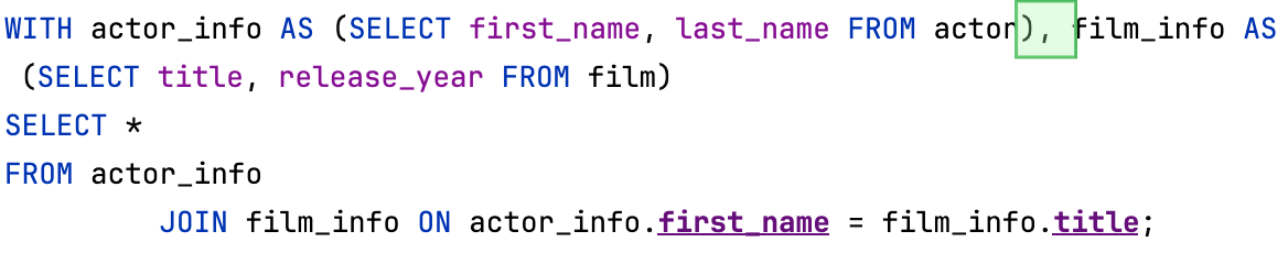 Place comma | Move a comma ( The Auto option analyzes the surrounding context and calculates the most suitable place for a comma. For example, you have three occurrences of a comma: two commas go at the beginning, one comma is at the end. The Auto option will move the third occurrence of the comma to the beginning. This option works only if you have more than three cases in a single context. Otherwise, commas are left as is. The In the middle option joins two lines of code on one line. If you want to disable a new line after the comma when the To begin option is enabled, clear the Line breaks checkbox on the Wrapping tab. The Place comma option works only if the Wrap subqueries option in the WITH clause section is set to Chop or Chop if long. The As in common option means that the behavior of the selected option must duplicate the behavior of the analogous option in the Common section on the Queries tab.