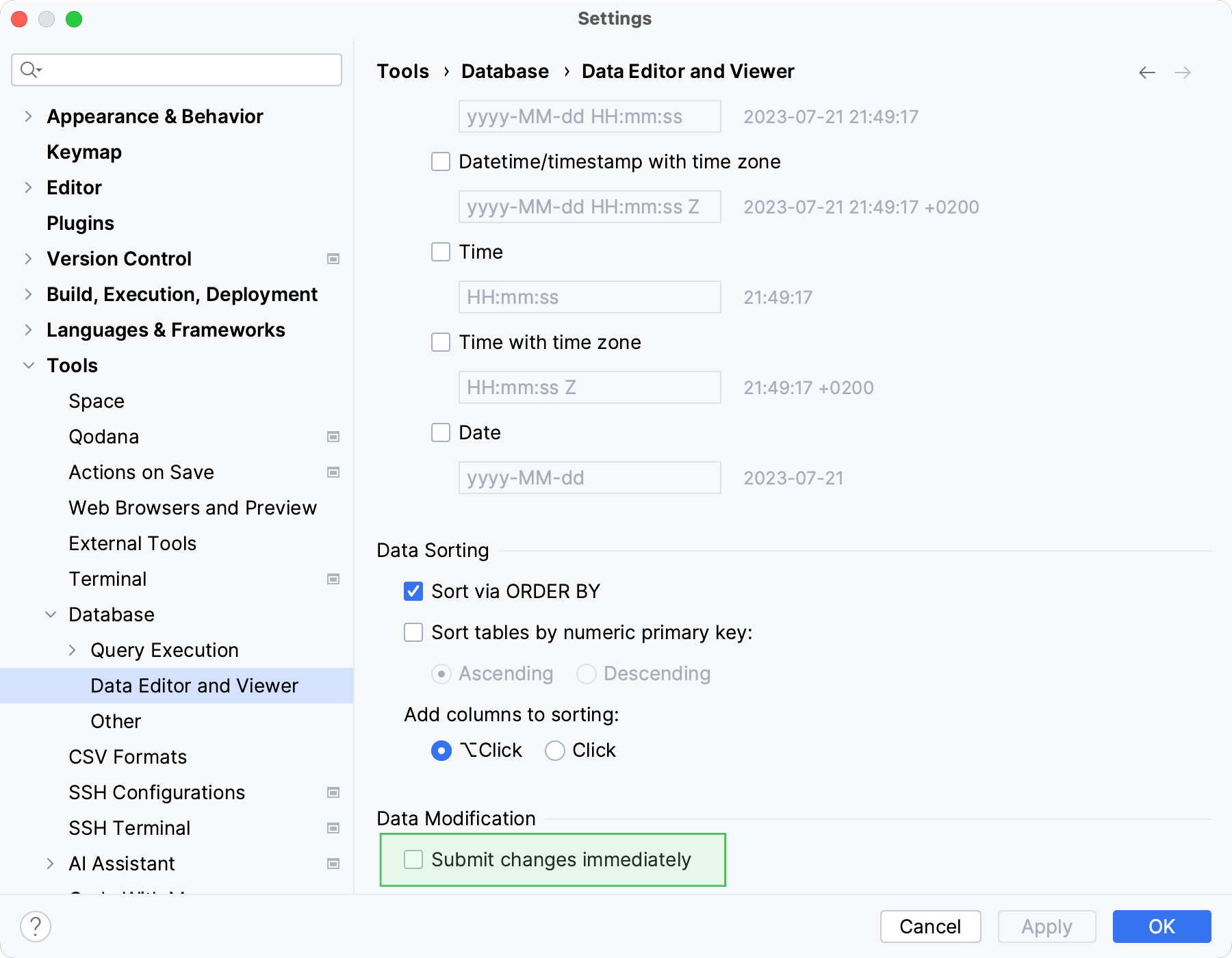 By default, changes are not submitted to a database unless you press the Submit icon , or press Ctrl+Enter. You can enable the Submit changes immediately option to submit your changes automatically.