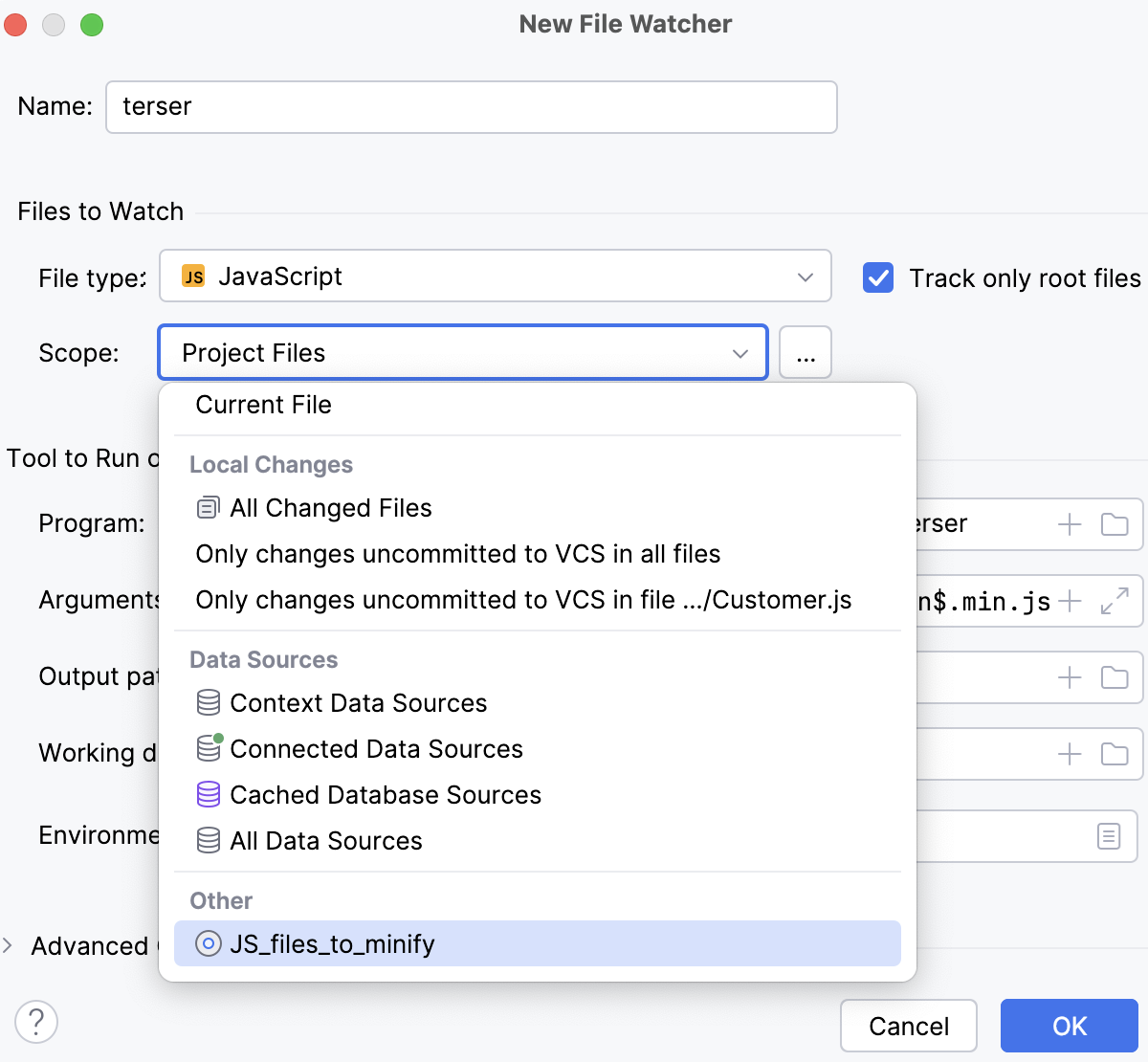 JetBrains Rider runs terser automatically when you change a JavaScript file from the selected scope.