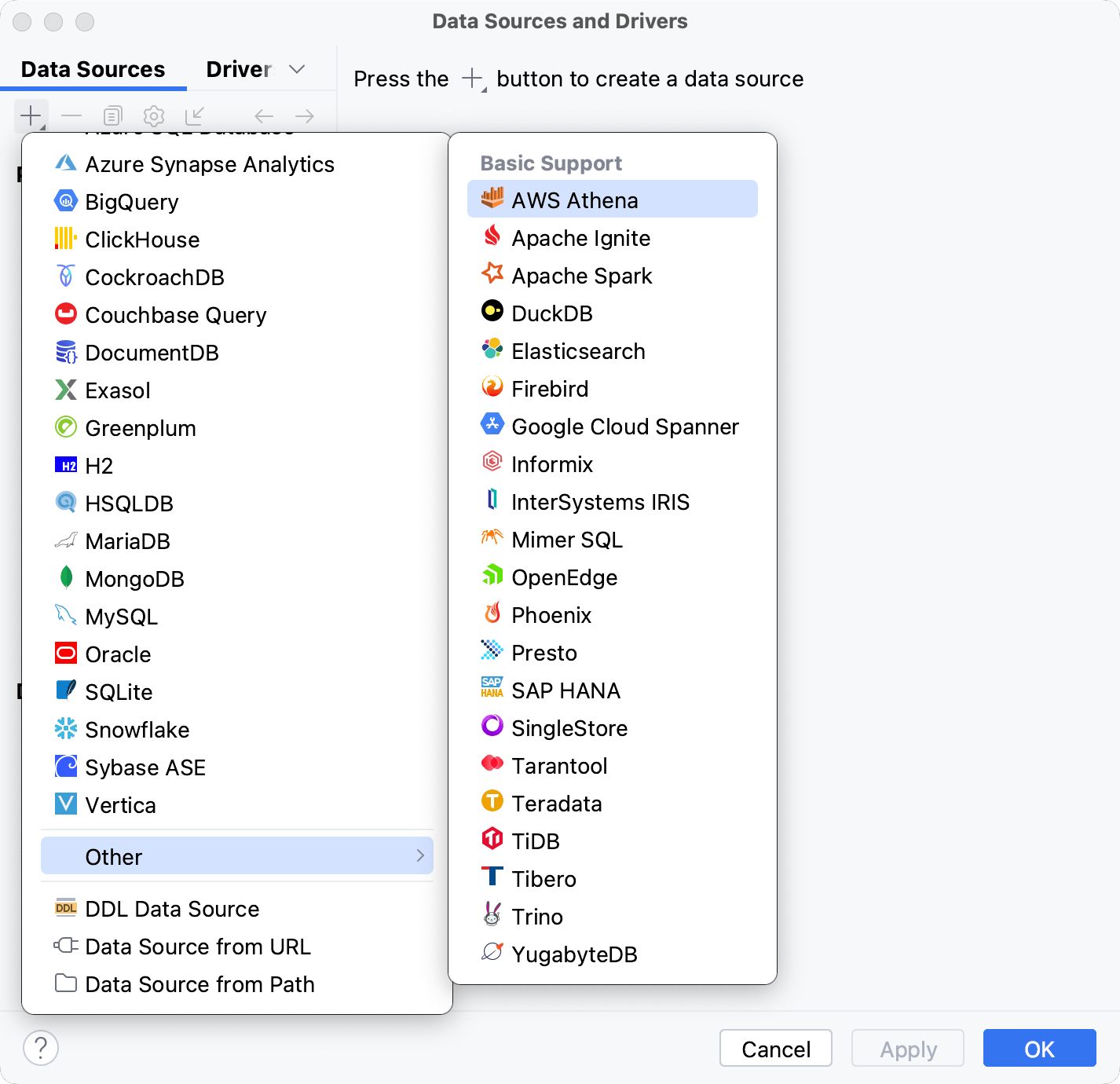 To create a data source, you need a JDBC driver. There are two types of drivers in JetBrains Rider: with Complete Support and with Basic Support. You can see a list of database vendors with complete and basic support on the Drivers tab in the Data Sources and Drivers dialog. Also, note that user-created drivers are considered as drivers with basic support.
