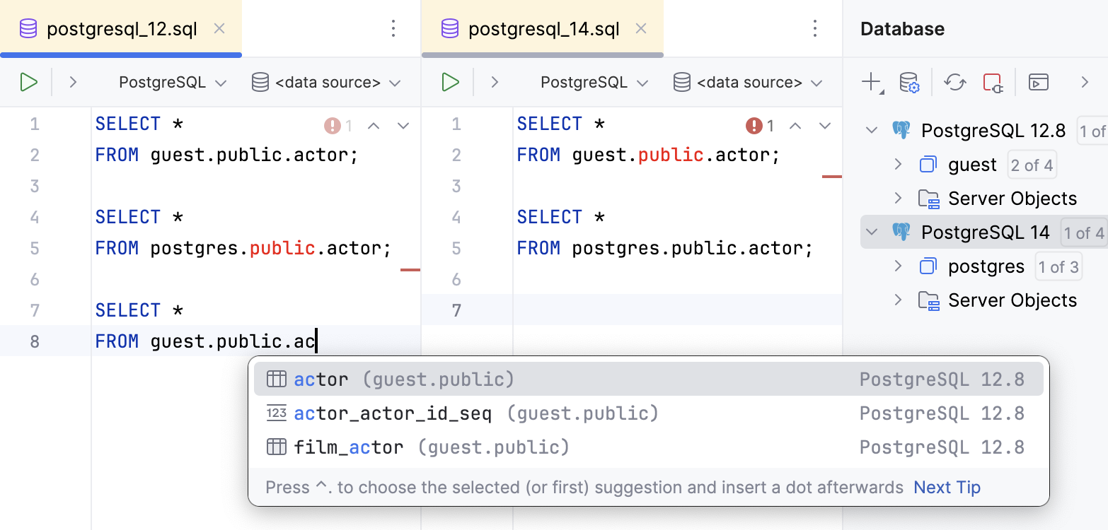 Both data sources have the actor table, but this table is stored in different schemas (guest.public.actor and postgres.public.actor). So, if we try to qualify the actor table or use code completion, completion suggestions will be associated with a corresponding data source.