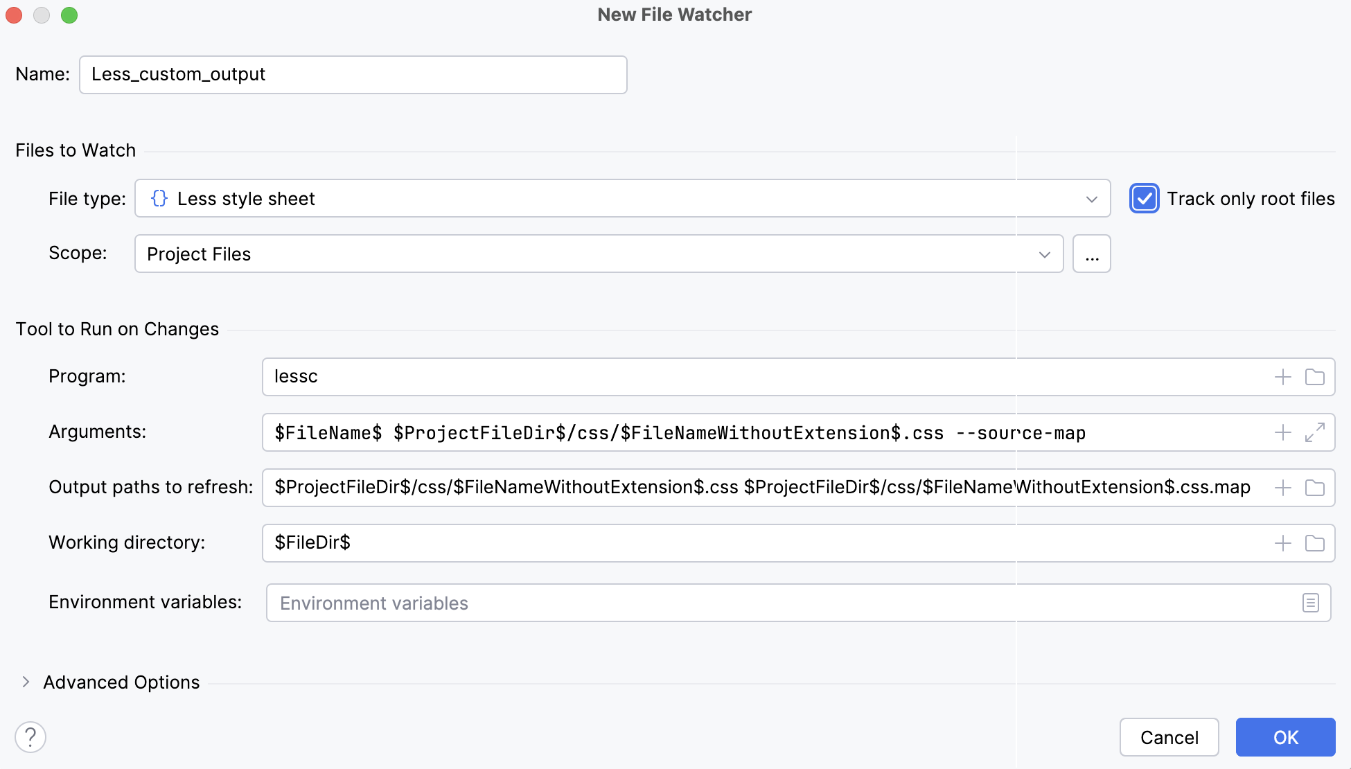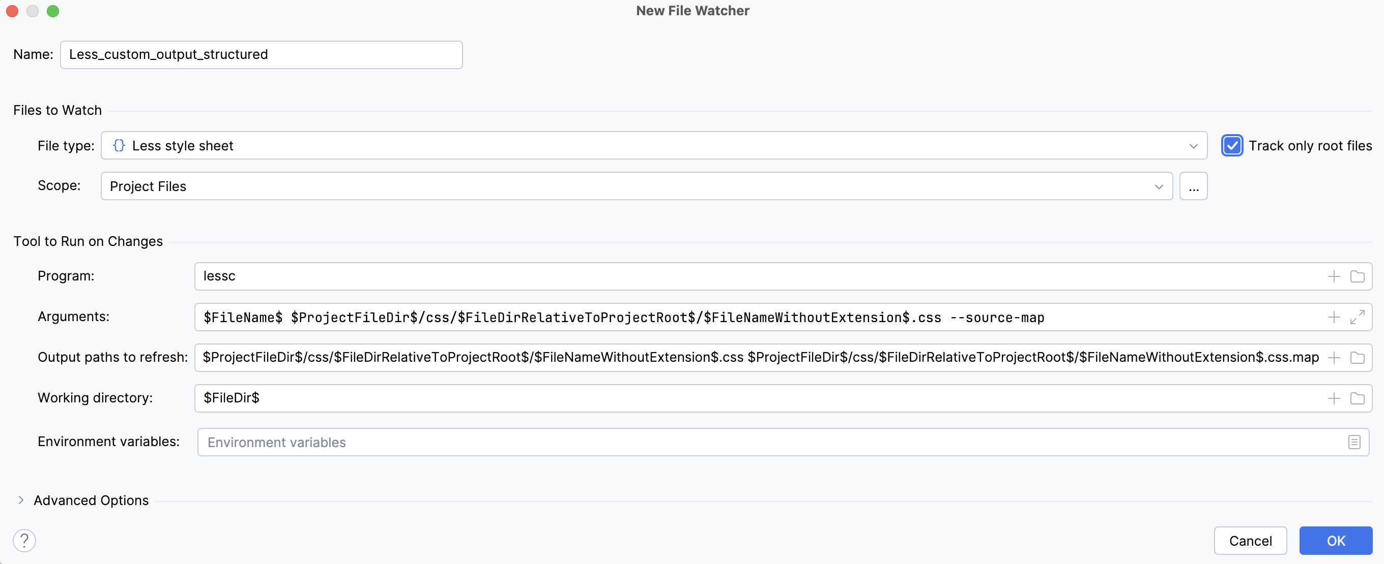 It would be convenient to store all the output in a separate folder, for example, css. Let's create a custom Less_custom_output File Watcher with the css folder as the output location.
