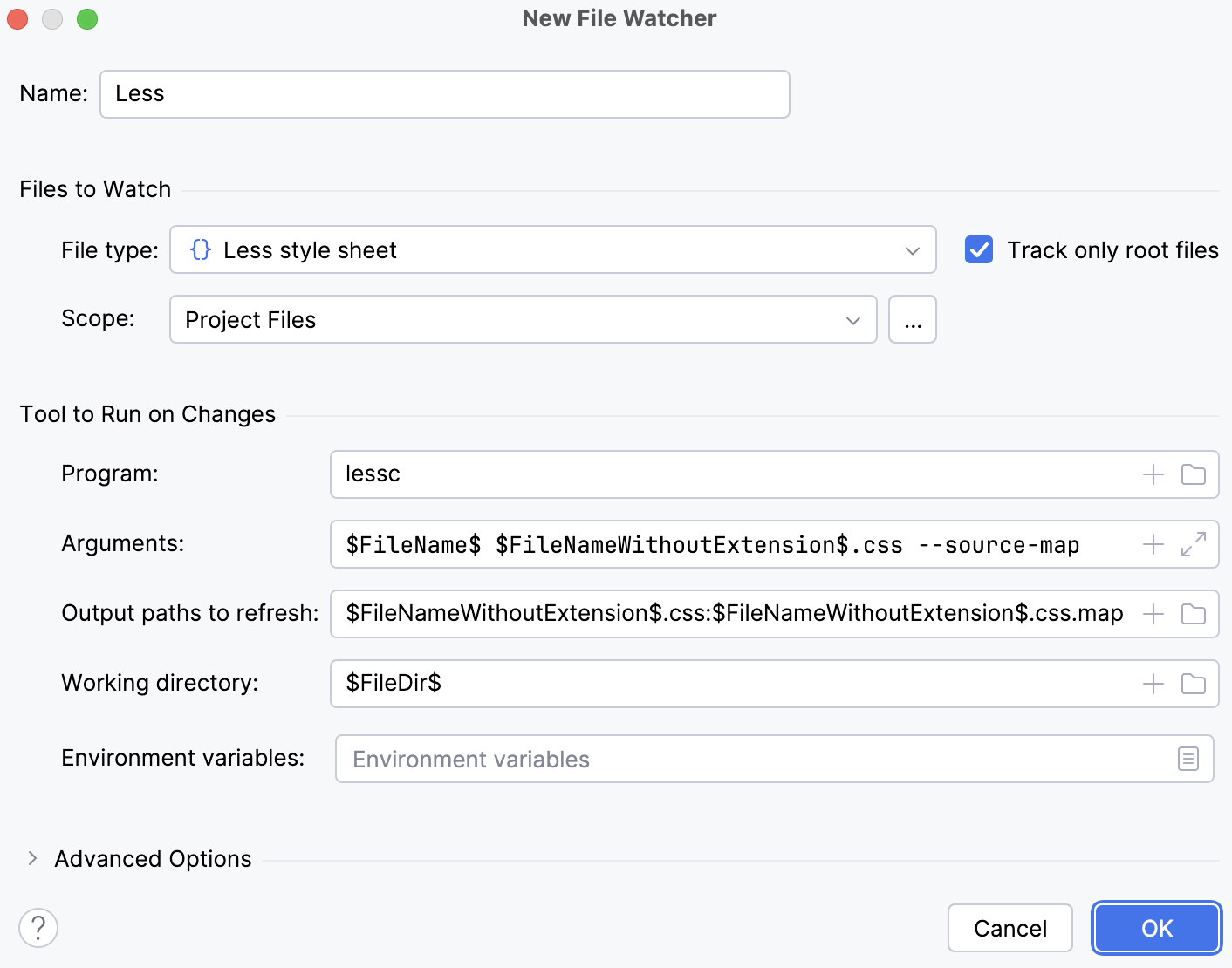 Although the default settings are sufficient to run the compiler successfully, let's still take a closer look at them to see how the File Watcher's behavior can be customized.