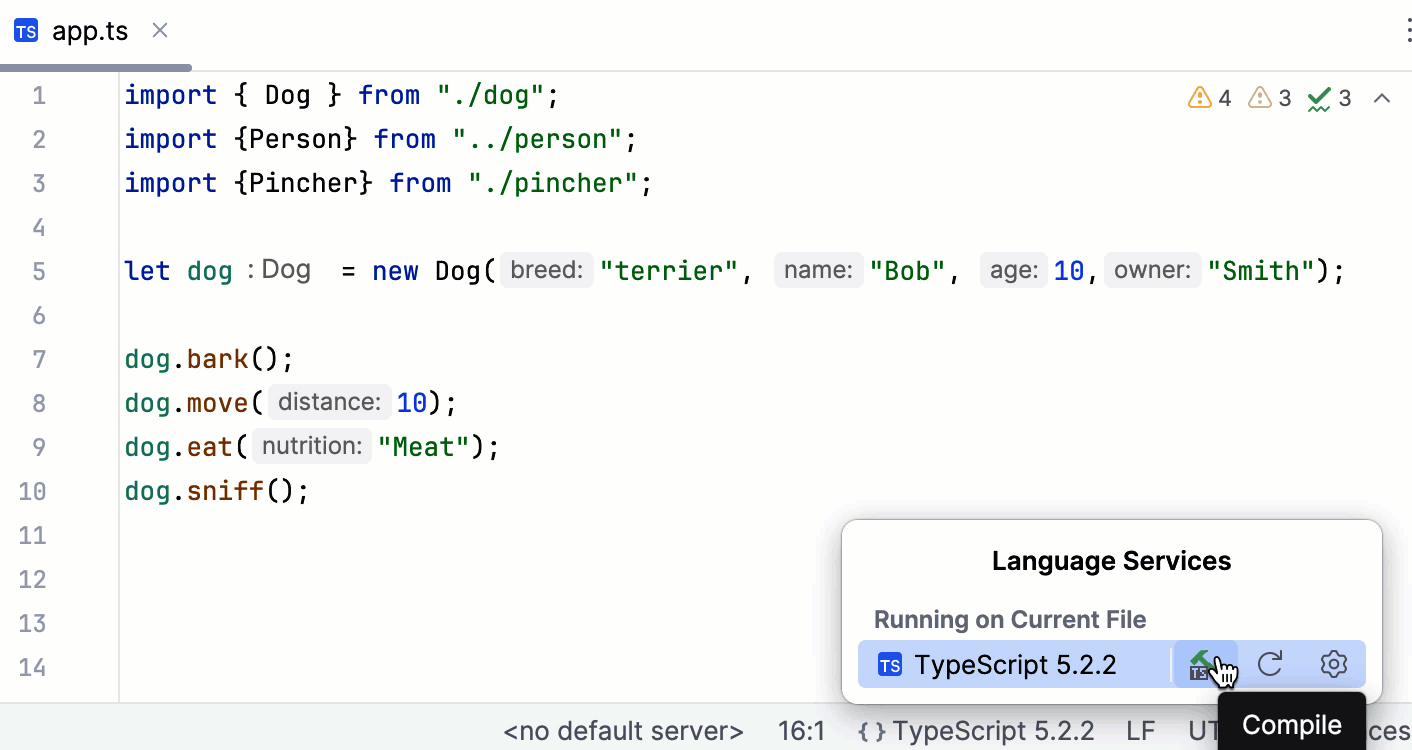 The TypeScript tool window lists compilation errors in TypeScript code. This list is not affected by changes you make to your code and is updated only when you invoke compilation again.