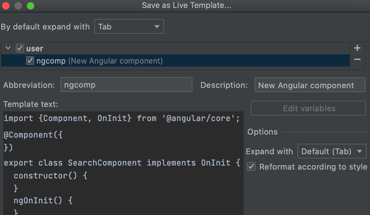 Let’s create an ngcomp template for an Angular component, similar to the default a-component. The template will have 3 variables: