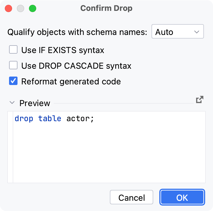 In the Preview pane, you can view and change the generated SQL code.