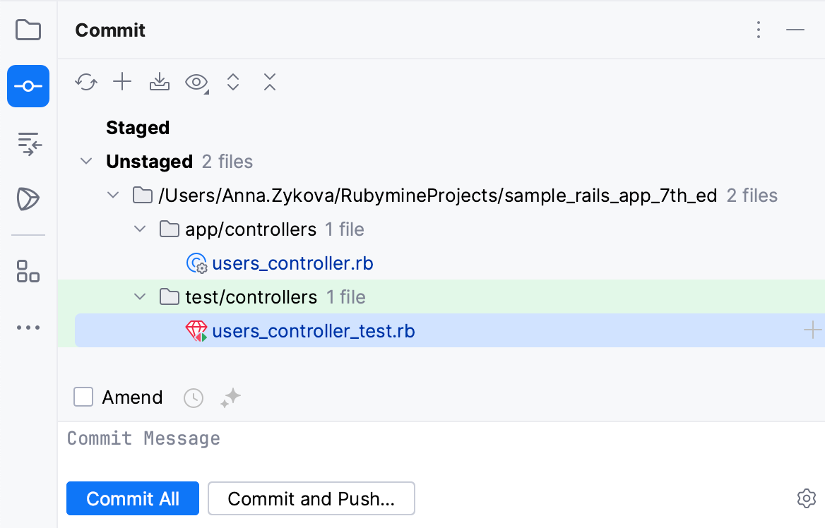 You can also select files under the Unversioned Files node — RubyMine will stage and commit these files in one step.