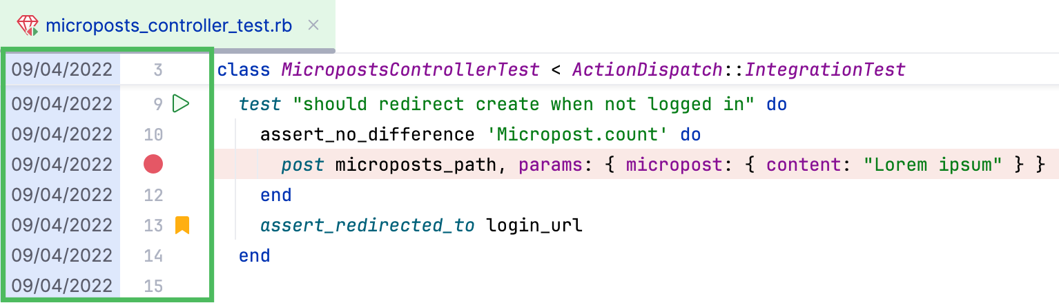 You can also track changes to a file as you modify it in the editor. All changes are highlighted with change markers that appear in the gutter next to the modified lines and show the type of changes introduced since you last synchronized with the repository. When you commit changes to the repository, change markers disappear.