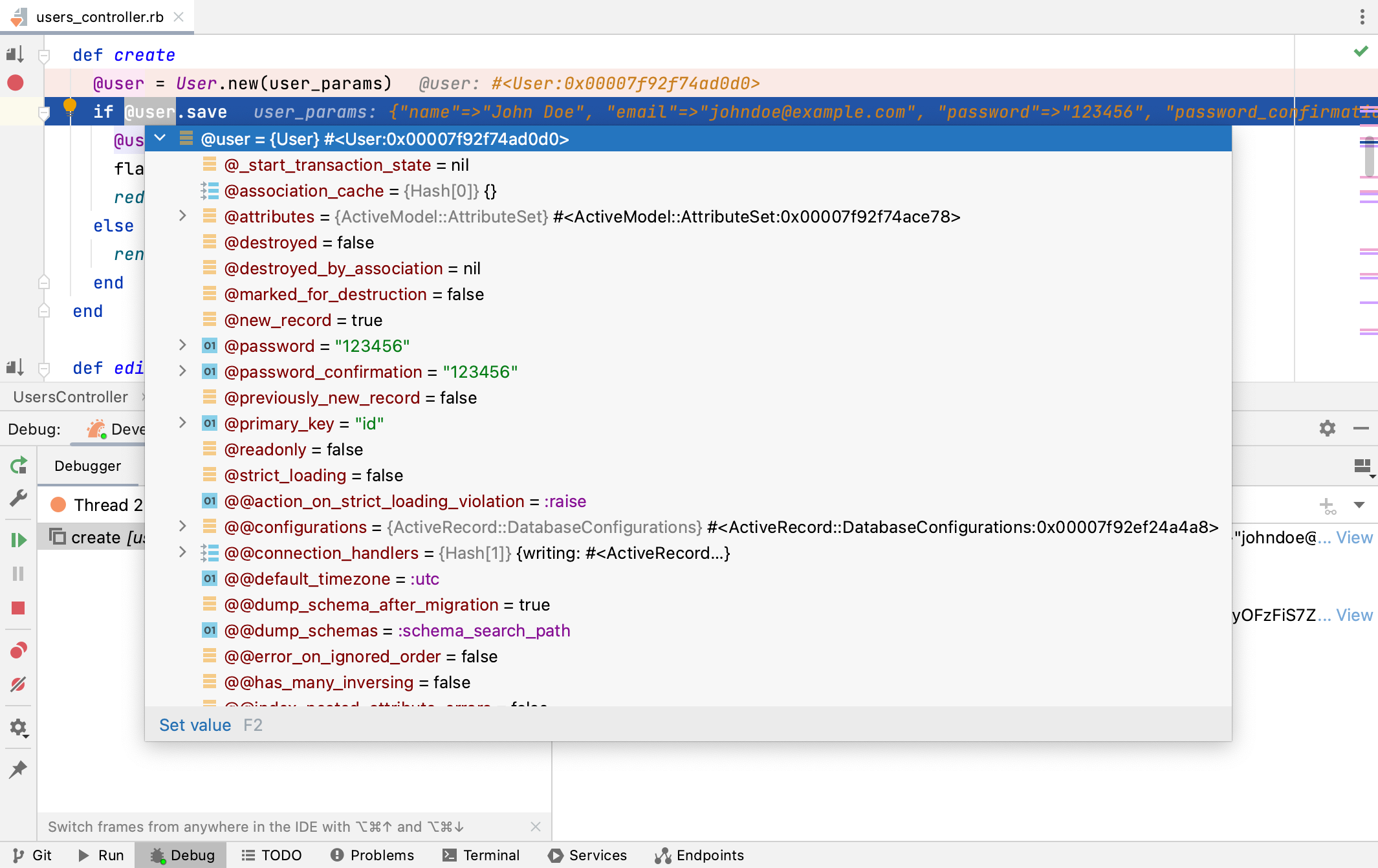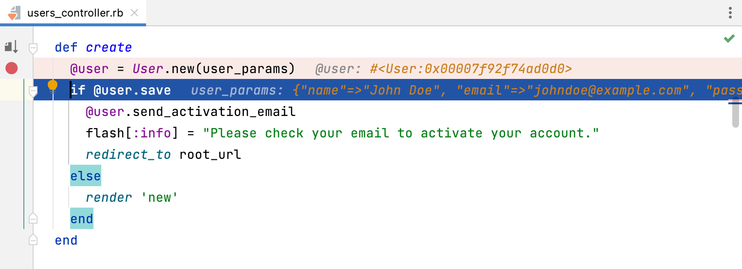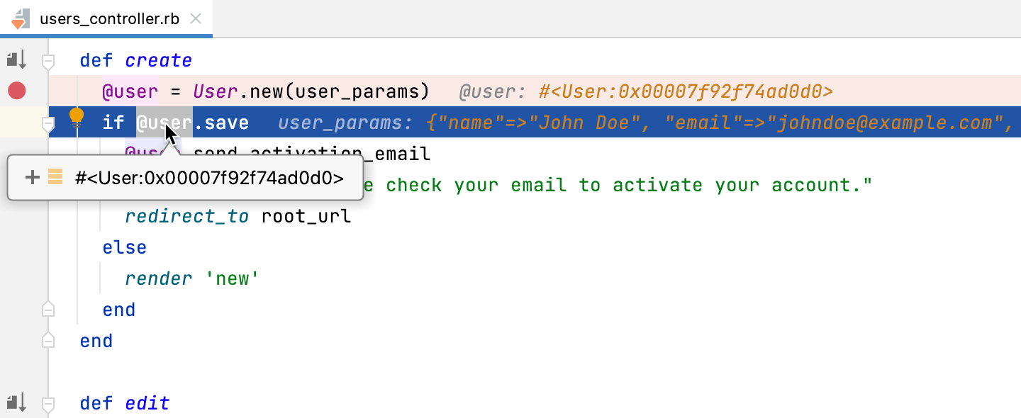 RubyMine lets you evaluate expressions during a debugging session to obtain additional details about the program state or test various execution scenarios at runtime.
