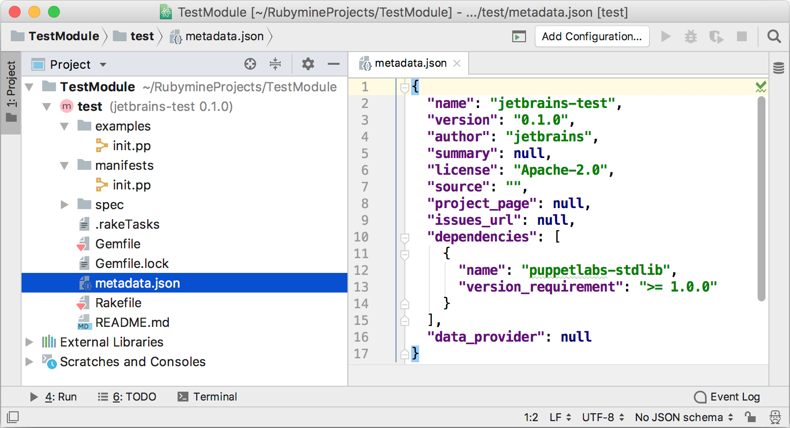 RubyMine supports the Puppet language syntax and allows you to work with Puppet modules and environments.