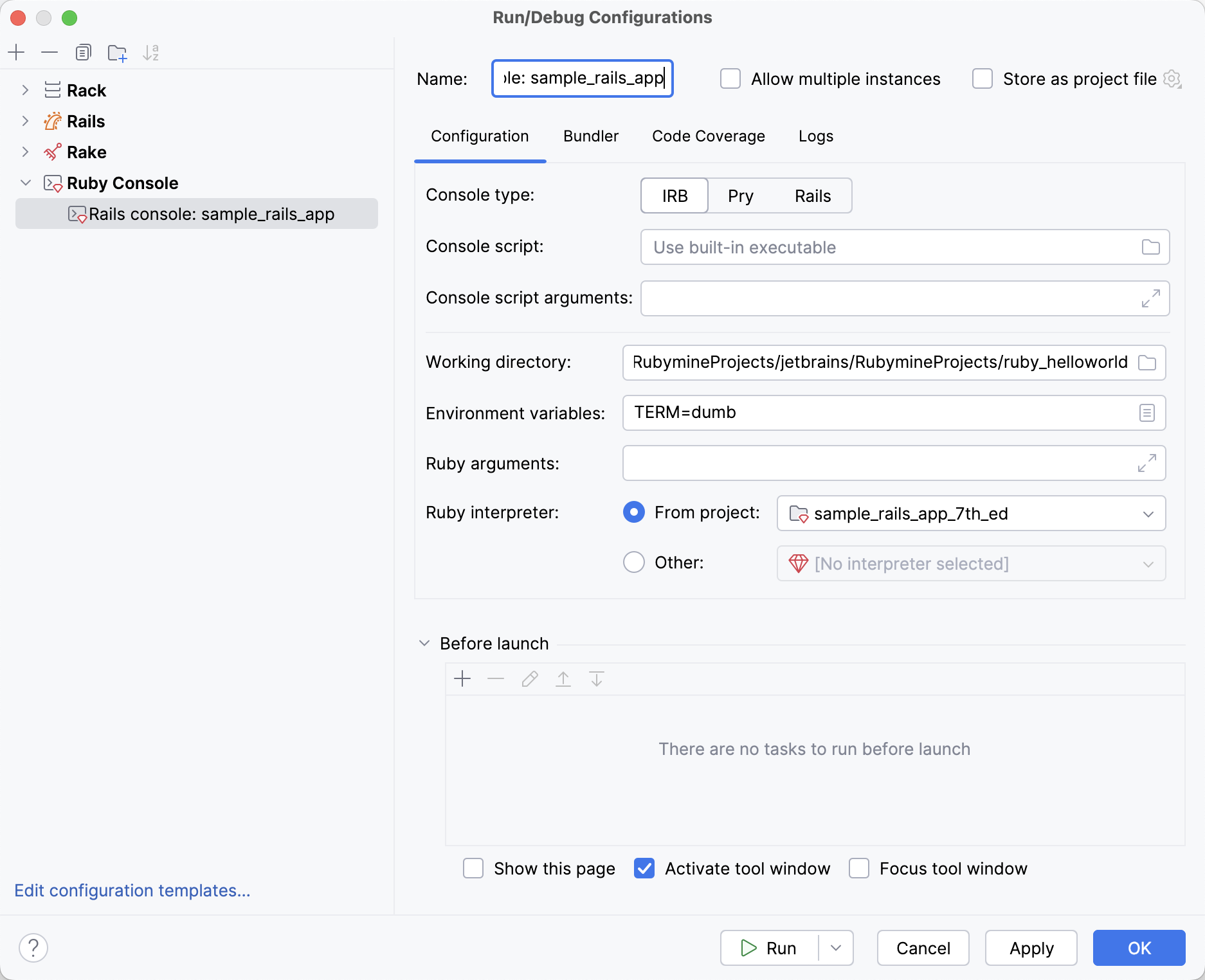 After you run the console for the first time, RubyMine creates the dedicated run configuration. If necessary, you can change the created configuration to provide additional options: change the environment, protect the database from changing data, and so on. For example, to use the --sandbox option to run the console, perform the steps below: