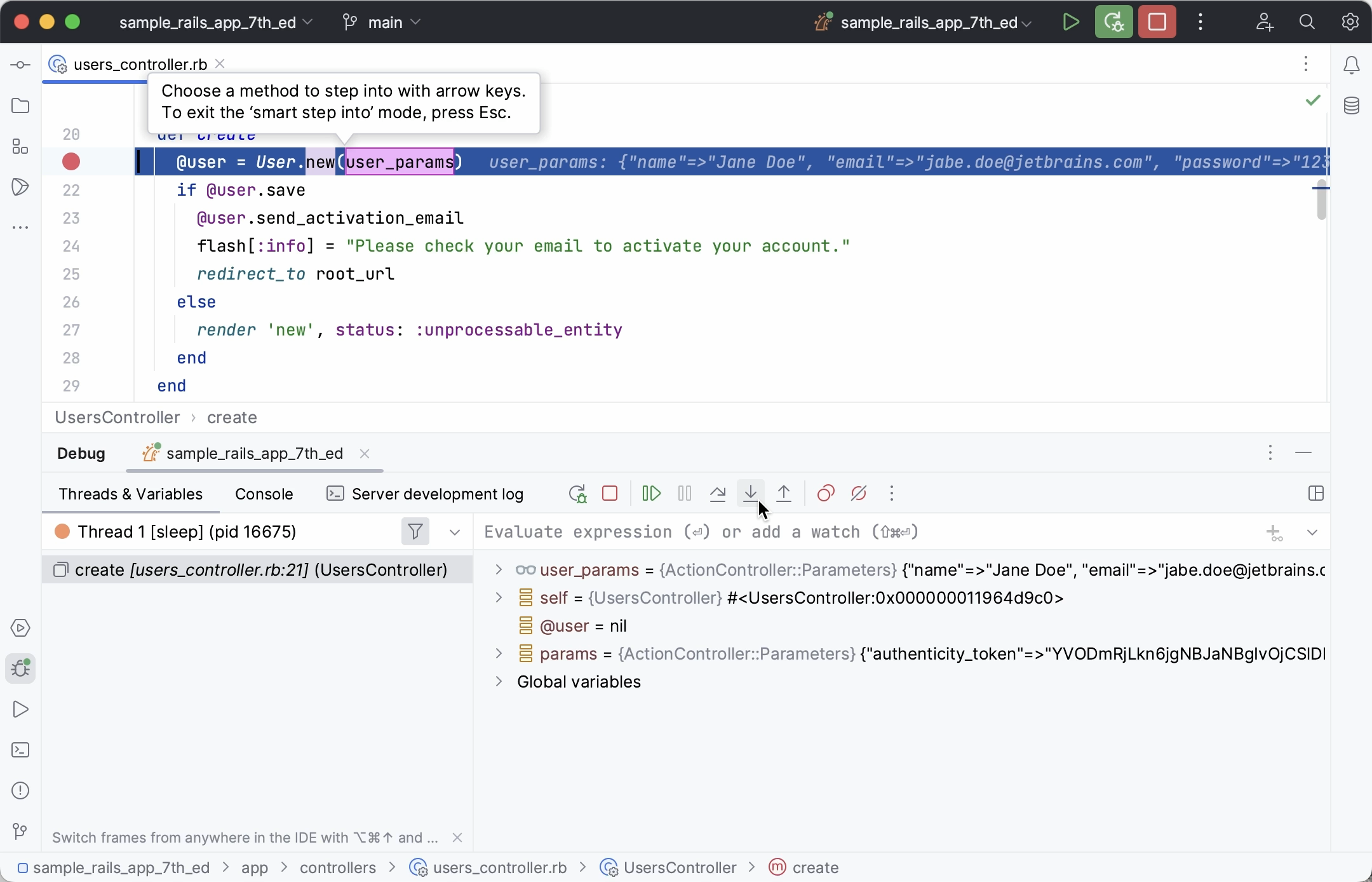 RubyMine provides you with a set of stepping actions. The choice of a particular stepping action depends on your strategy, such as whether you need to go directly to the next line or inspect the intermediate method calls as well.